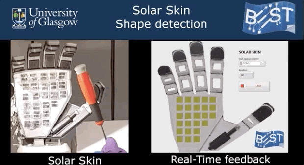 為了解決這個問題,格拉斯哥大學的研究人員開發了一種由微型太陽能電池制成的能量發電電子皮膚,不需要專用的觸摸傳感器。這種太陽能電池不僅可以自己發電,還可以產生一些多余的能量,而且還可以觸摸和接近感應。他們的研究成果的早期論文已經發表在 IEEE 機器人學會期刊上。