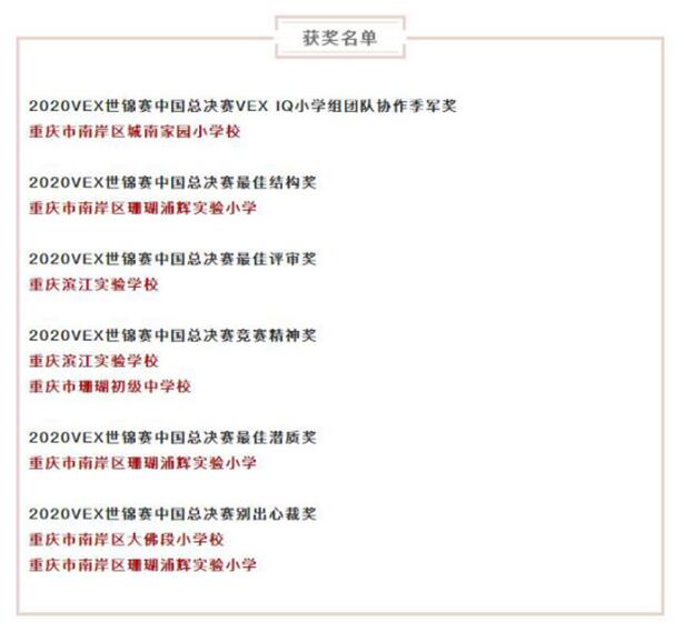 12月27日,來自我區(qū)的城南家園小學(xué),經(jīng)過三天激烈的比賽,在“VEX2020機(jī)器人世界錦標(biāo)賽中國總決賽”中VEX IQ小學(xué)組團(tuán)隊(duì)協(xié)作季軍獎(jiǎng),南岸區(qū)珊瑚浦輝實(shí)驗(yàn)小學(xué)榮獲三個(gè)專項(xiàng)獎(jiǎng),重慶濱江實(shí)驗(yàn)學(xué)校榮獲兩個(gè)專項(xiàng)獎(jiǎng),重慶市珊瑚初級中學(xué)校、南岸區(qū)大佛段小學(xué)校各榮獲一個(gè)專項(xiàng)獎(jiǎng)。