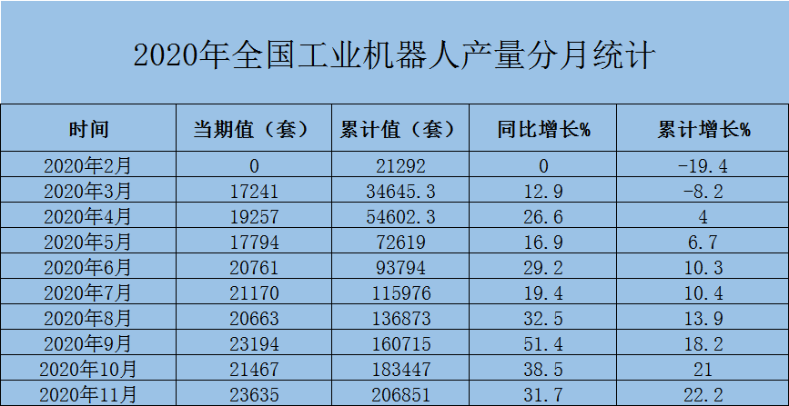 日前,國家統計局發布數據,11月份,全國規模以上工業企業的工業機器人產量23635套,同比增長31.7%;1-11月全國規模以上工業企業的工業機器人產量為206,851套,累計增長22.2%。