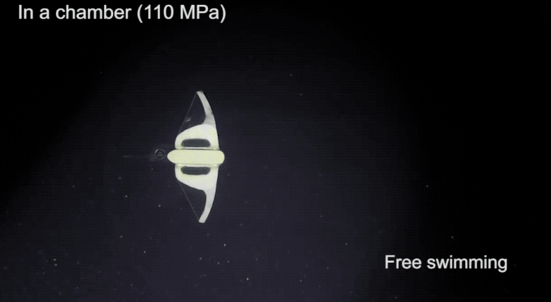 圖|軟體機器人在測試在 110 MPa 的靜水壓力中測試(來源:Nature)