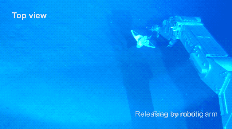 在中國南海的現場試驗中,軟體機器人由遙控潛水器(ROV)攜帶到 3224 米的深度。在 8kV 交流電壓和 1Hz 的驅動下,該機器人以 5.19cm 每秒(即每秒 0.45 體長)的速度拍打雙鰭運動,成功實現自由游動。