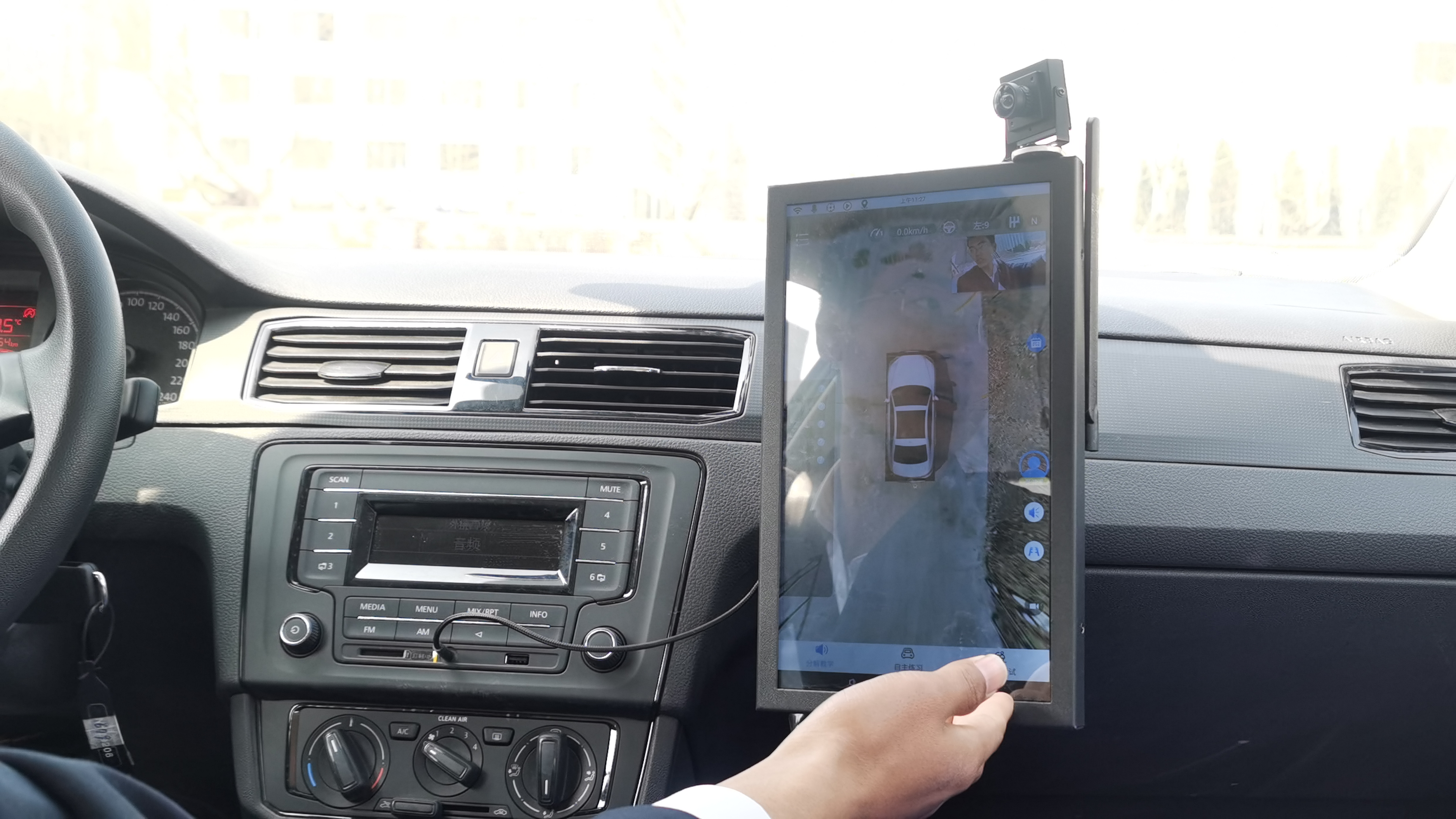 當天上午,記者在順達駕校訓練場內看到,從外表上看,安裝了智能“機器人教練”的車輛和其他教練車并沒有太大的不同,只是車身上多了一些小設備。據順達駕校工作人員李金輝介紹,智能教練車身上方裝有測量型天線,后備廂里藏有可以實現GPS定位和接收發射信號的智能主控系統,副駕駛位置則由一套帶有智能系統的平板顯示器替代了傳統的教練,可以運用該系統的語音、電子顯示屏等來對學員進行教學。
